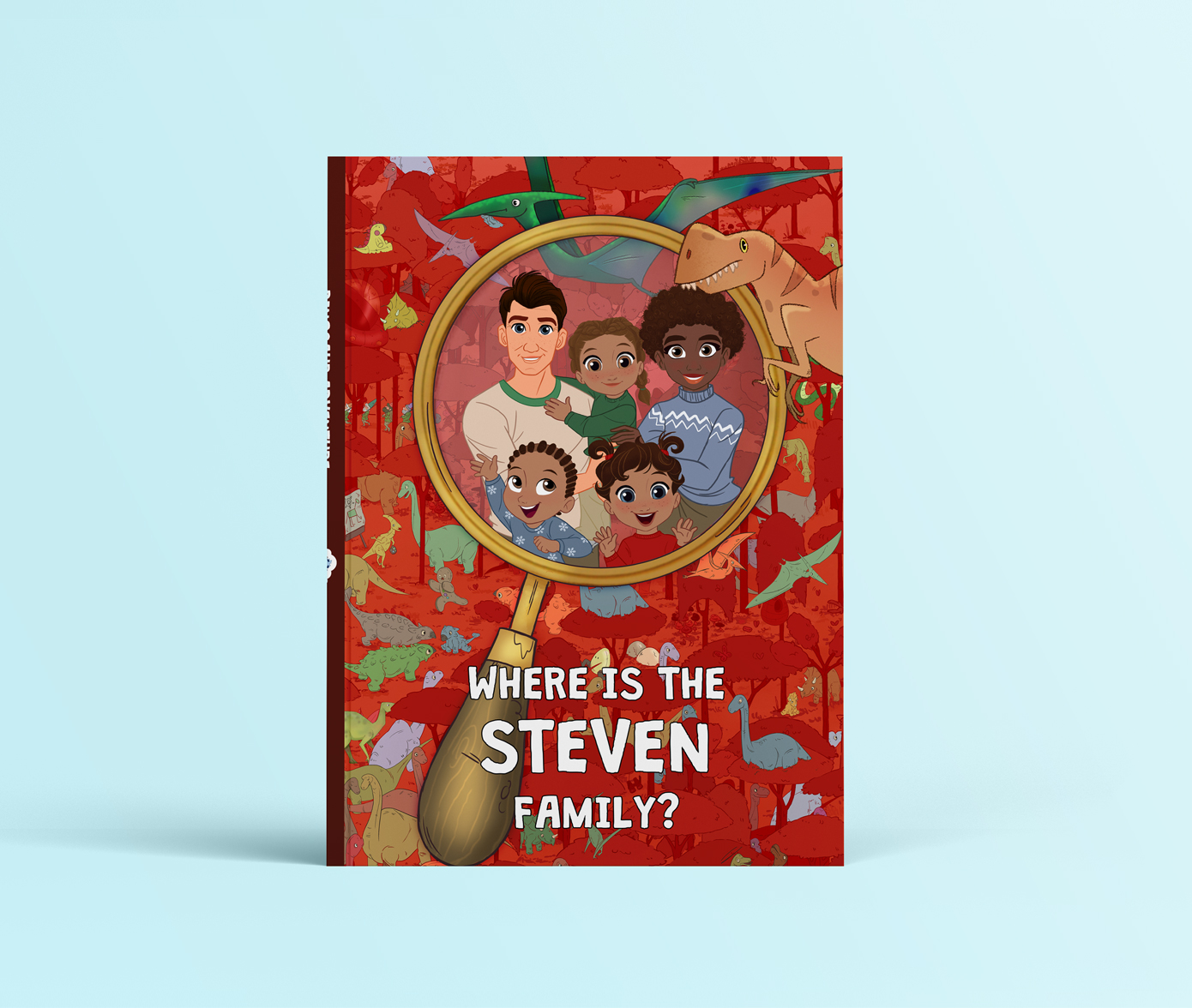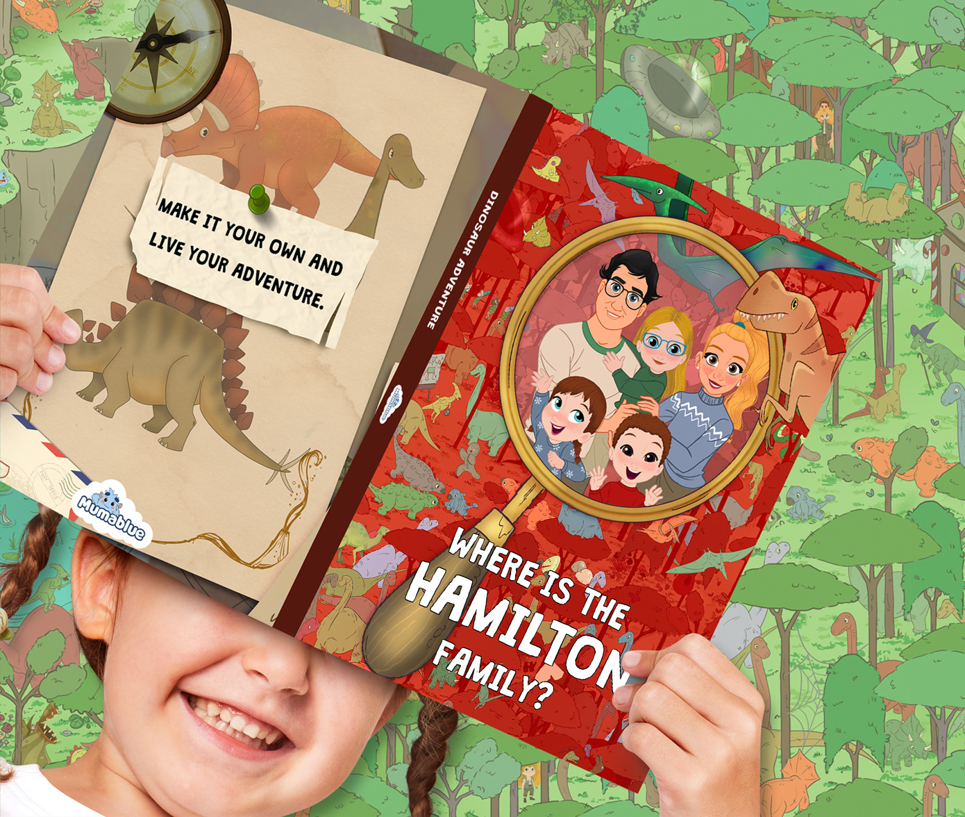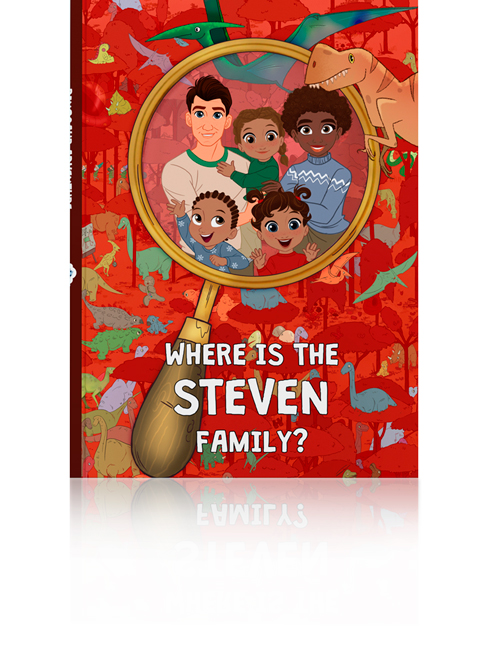 "Where is the (Last name) family? Dinosaur adventure" is a personalised dinosaur book that invites families to share play time together. Each member will be faithfully represented with his/her name and physical traits. The best gift idea!
