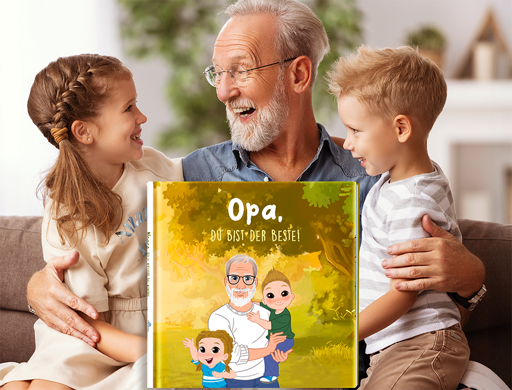 Opa, du bist der Beste! Dieses personalisierte Buch für Opa feiert die besondere Beziehung zu den Enkelkindern. Personalisieren Sie Namen, Widmungen und Szenen wie Spiele, Spaziergänge oder gemeinsame Übernachtungen. Perfekt für seinen Geburtstag, Weihnachten oder den Großelterntag. Mit dieser illustrierten Geschichte wird Opa zum Helden, den sie immer wieder mit Stolz lesen werden. Ein bewegendes Geschenk, das für immer in Ehren gehalten wird.