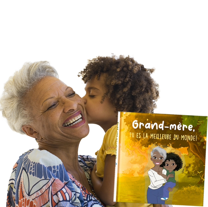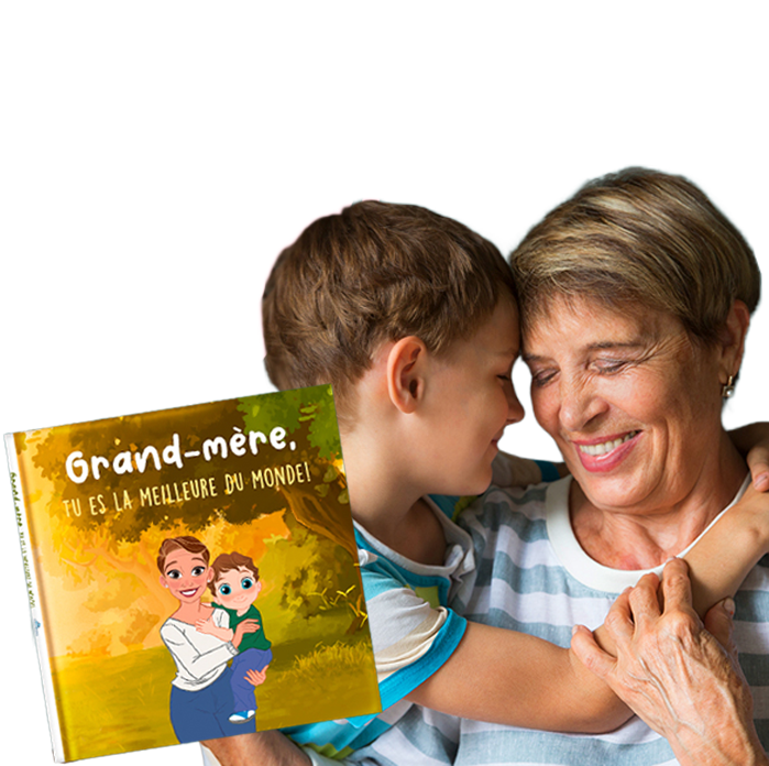 Livre personnalisé pour la grand-mère qui la représente avec ses petits-enfants, un cadeau pour lui dire combien ils l’aiment.