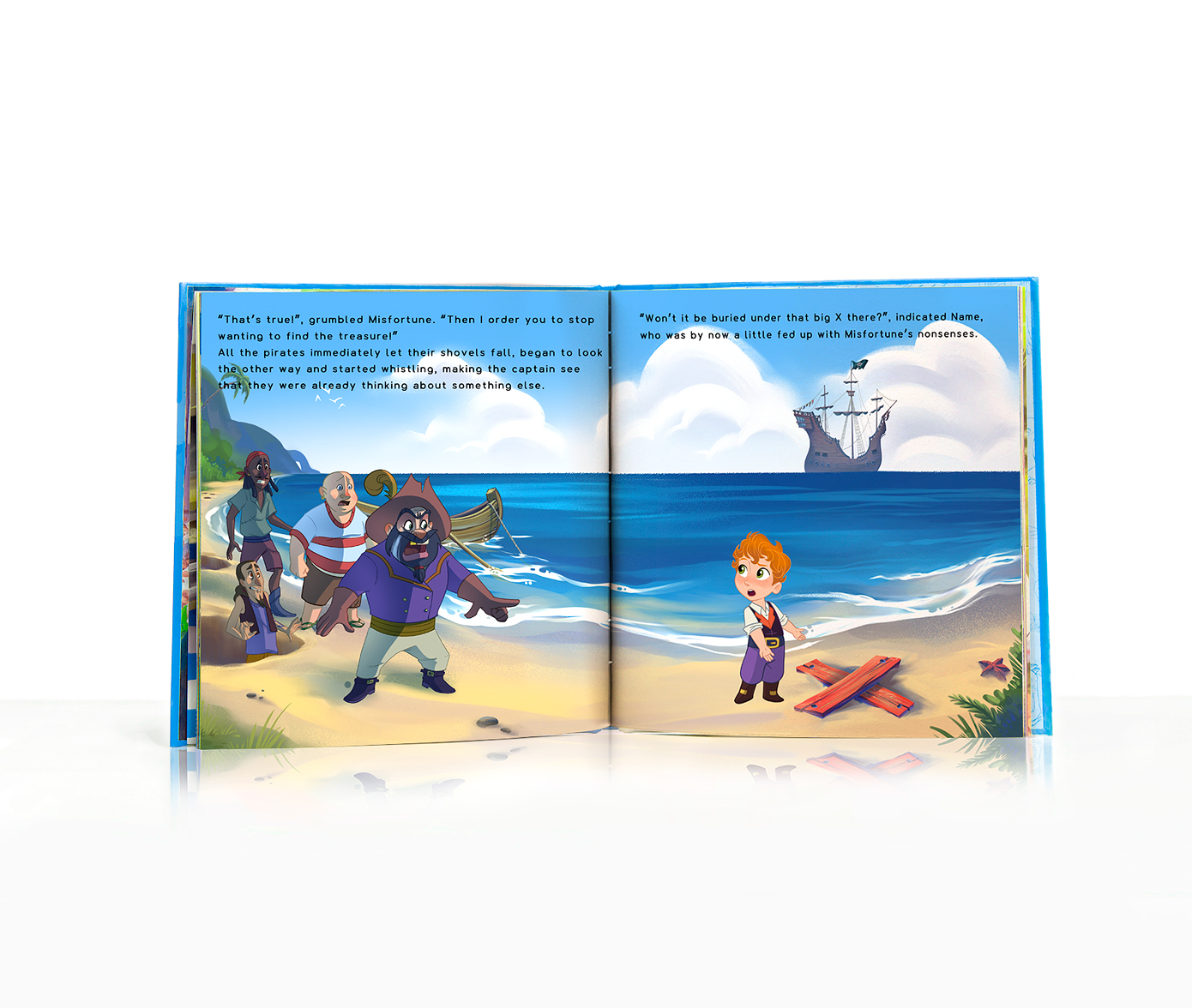 “Name and the pirate treasure" is one of our most ambitious personalised stories, a personalised adventure story in which the child plays an important role by teaching a crew of brutes and miscreants the real values that should prevail on the high seas. This is one of the most wonderful stories to give to children!