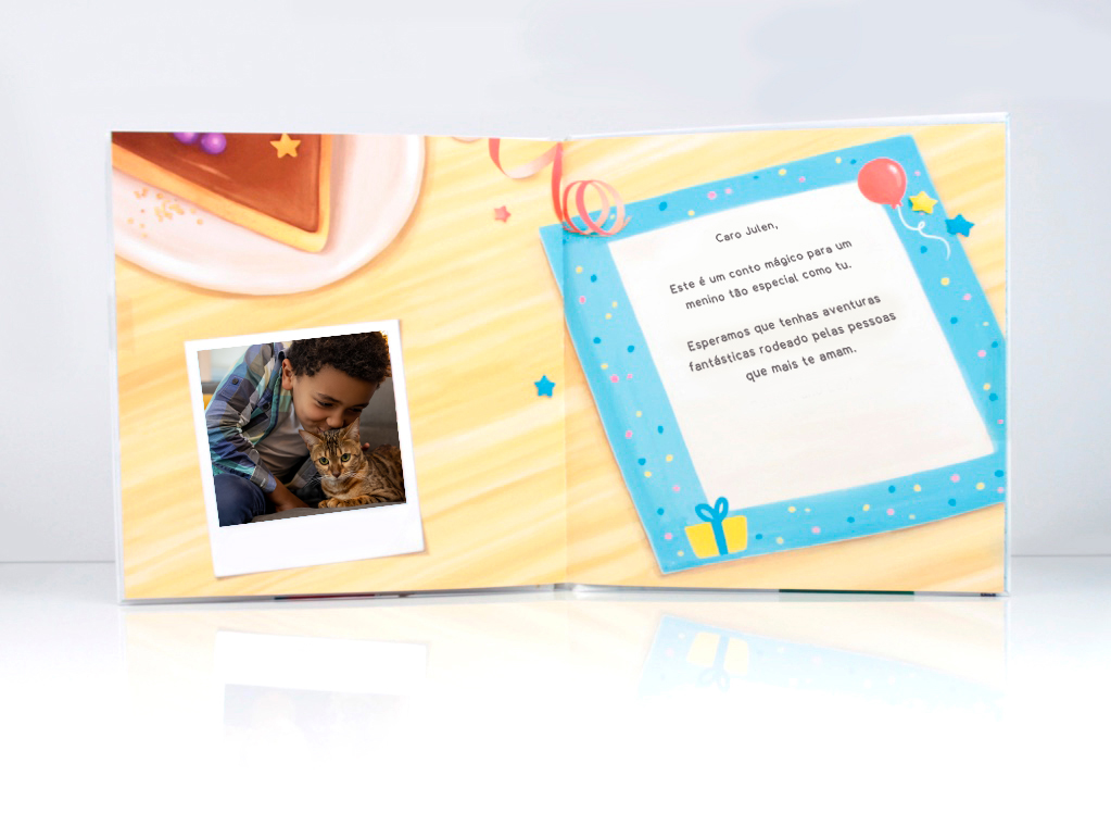 "Uma amizade para sempre! A criança e o seu animal de estimação" é um livro infantil personalizado com um animal de estimação, no qual uma ou duas crianças viverão uma aventura extraordinária com o seu querido animal de estimação, escolhendo entre um cão ou um gato. Neste conto personalizado, é possível representar o animal de estimação da família com grande precisão graças às inúmeras opções de personalização oferecidas, que incluem o tamanho, a raça, o tipo de olhos ou a cor do pelo do animal. É igualmente possível incluir o nome, para que os pequenos leitores, também personalizados com as suas caraterísticas físicas e o seu nome, possam identificar-se plenamente com a história.